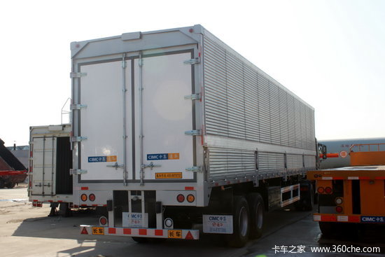 厢式半挂车载货部位为框架结构且无底板,专门运输集装厢的半挂车,第一第三车是拉散货的,中间拉配货的全封闭箱车,适用于家用电器、轻纺货物、煤炭、沙石等建筑材料以及图盘货物的运输。